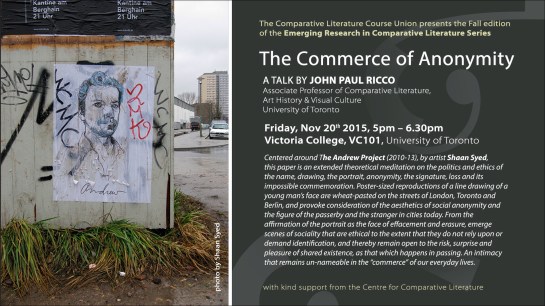 Here is the link to the audio file on YouTube of my Lecture, On the Commerce of Anonymity, that I presented on November 20, 2015, as part of the Emerging Research in Comparative Literature Series, at the University Toronto.